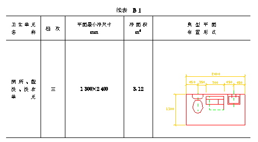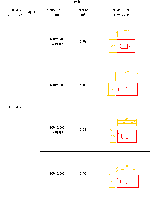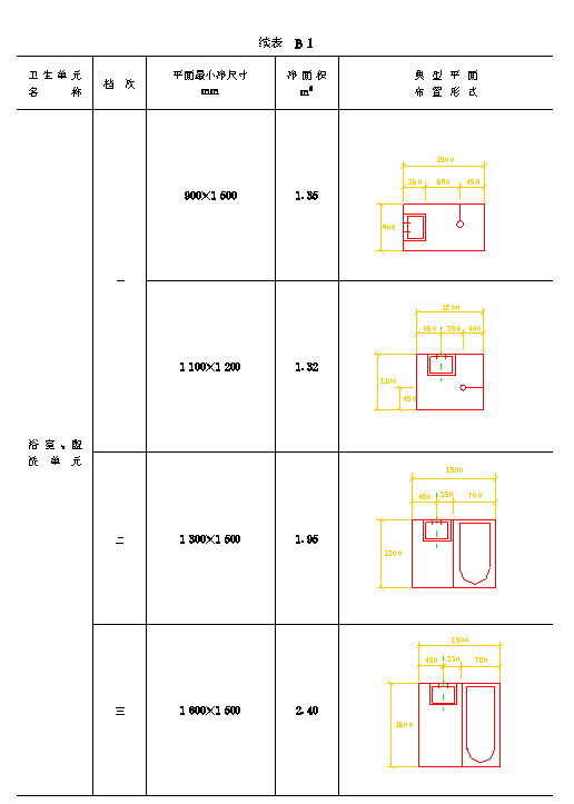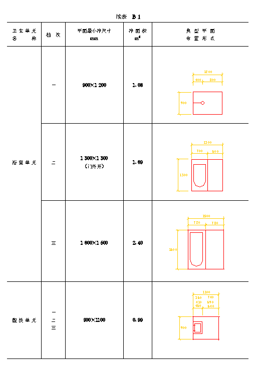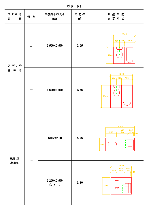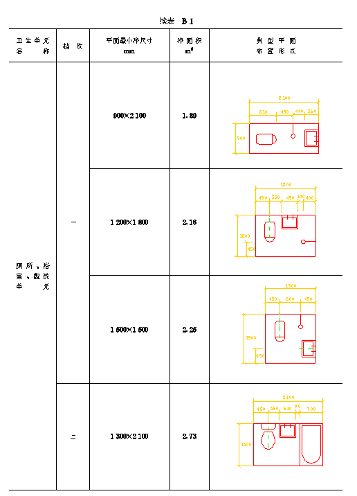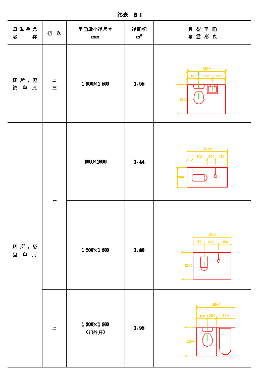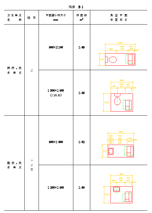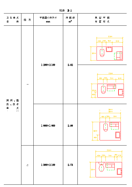 附录B 各卫生单元平面最小净尺寸、净面积及典型平面布置形式(参考件)