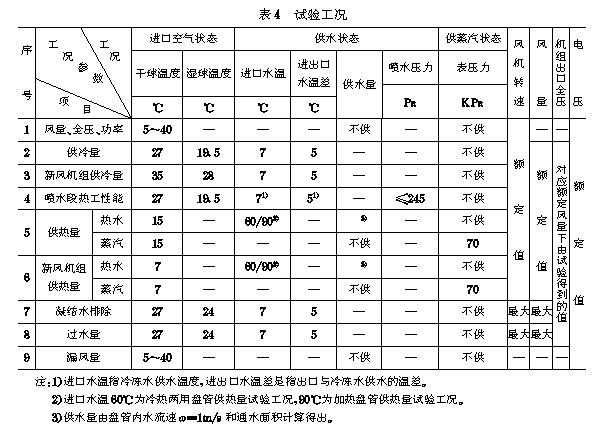 试验方法 6.1 一般要求 6.1.1 试验机组应按功能段组成整机进行试验。 6.1.2 试验机组应按产品说明书要求组装和安装,除非在试验方法中有规定,决不允许采取任何特殊处理措施。 6.2 试验条件 6.2.1 试验工况应符合表4的规定。 6.2.2 试验工况和测试操作的允许偏差应符合表5的规定。 6.2.3 试验用的仪表应符合表6的规定。 6.3 性能试验方法 6.3.1 启动试验 a.试验机组在额定电压条件下启动,稳定运转5min,切断电源,停止运转,至少反复进行三次; b.检查零部件有无松动、杂音、发热等异常现象; c.变风量机组应在最大风量和最小风量下进行启动试验。 6.3.2 盘管耐压性能试验 在5.3.2规定的试验压力条件下试压。 6.3.3 额定风量和全压试验 应按附录A(补充件)或附录B(补充件)规定的方法进行试验,型式检验时,当额定风量小于等于60000m3/h时,应按附录A的方法试验,当额定风量等于大于80000m3/h时,可按附录B的方法试验。 6.3.4 输入功率试验 按附录A规定的方法测量。 6.3.5 漏风量试验 按附录C(补充件)规定的方法测量漏风量。 6.3.6 供冷量和供热量试验 a.供冷量和供热量应在表4规定的试验工况下,按附录D(补充件)的方法进行试验。 b.也可直接引用GB10223规定的方法得出的盘管传热系数公式计算出供冷量和供热量,并按附录E(参考件)规定的方法进行现场验证。 6.3.7 喷水段的空气热交换效率 按附录D的方法试验。 6.3.8 挡水板过水量试验 按照附录D中D2.2.8条的方法试验。 6.3.9 空气过滤效率和阻力试验。 按GB12218规定的试验方法进行过滤器效率和阻力试验。 6.3.10 凝露试验 在使用环境的露点温度为22.8~26.2℃和机组供水温度7℃的条件下,机组供冷连续运行6h,检查机组表面凝露情况。 6.3.11 凝结水排除能力试验 按表4规定的试验工况,预先将凝水盘中水注满至排水口,机组供冷连续运行4h,检查排水状况。 6.3.12 噪声试验 机组噪声应按GB9068规定的工程测定法测量。 6.3.13 振动试验 a.用表6规定的仪表,在试验机组底板四角处相互垂直的三维方向上测量振动速度; b.取最大值为机组的振动速度。 6.3.14 断面风速均匀度试验 a.在距盘管或过滤器迎风断面200mm处,按附录B中图B1,均布风速测点; b.用风速仪测量各点风速,统计所测风速与平均风速之差不超过平均风速20%的点数占总点数的百分比。 6.3.15 安全性能应按GB10891的规定试验。 6.4 外观检查 用目测法检查 6.5 材料试验 6.5.1 玻璃钢的树脂含量试验应按GB2577规定的方法。 6.5.2 玻璃钢的固化度试验应按GB2576规定的方法。 6.5.3 玻璃钢的弯曲强度试验应按GB1449规定的方法。 6.5.4 玻璃钢阻燃性能氧指数试验方法应符合GB2406规定。 |
