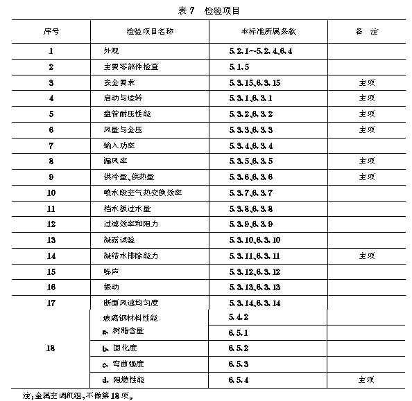 检验规则 7.1 检验分类和检验项目 7.1.1 机组检验分出厂检验(交收检验)和型式检验。 7.1.2 检验项目按表7。 7.2 出厂检验 7.2.1 每台机组(各功能段)必须经制造厂检验部门检验合格,并附有质量检验合格证,方可出厂。 7.2.2 机组的出厂检验,应按表7中1、2、3、4、5等项逐台检验。表7中6、7两项,每20台至少抽检一台,年产量不足20台抽检一台。 7.2.3 玻璃钢机组还应进行表7中18项检验,其中a.、b.、d.三项逐台检验。 7.3 型式检验 7.3.1 机组有下列情况之一时,应进行型式检验。 a.试制的新产品定型时; b.定型产品的结构、制造工艺、材料等更改对产品性能有影响时; c.停产一年以上,恢复生产时; d.转厂生产时; e.批量生产时每三年进行一次; f.国家质量监督机构提出型式检验要求时。 7.3.2 机组的型式检验应包括表7全部项目。 7.3.3 型式检验抽样方法,应在通过出厂检验的合格品中抽取。抽取样品的数量按表8。 7.3.4 判定规则 a.对于抽取的一台样品,检验项目中主项有一项或其他项有两项不合格,则判该样品为不合格品。 b b.在抽取样品中,有一台不合格,则再抽取一台,如检验仍不合格,则该批机组判为不合格品。 |